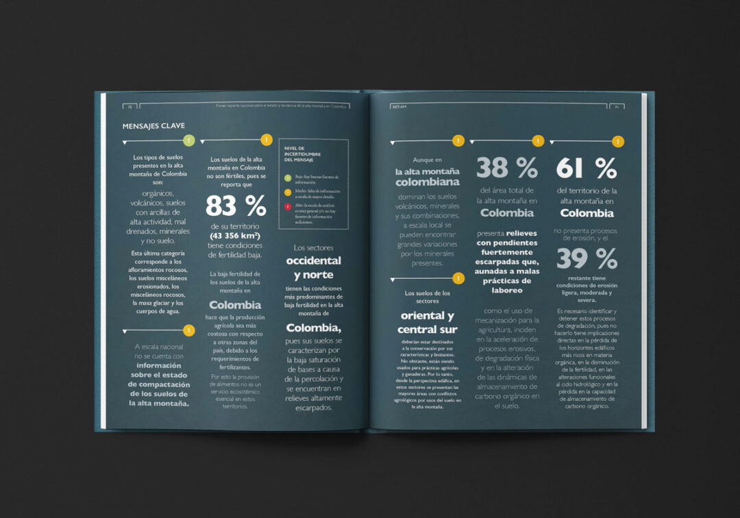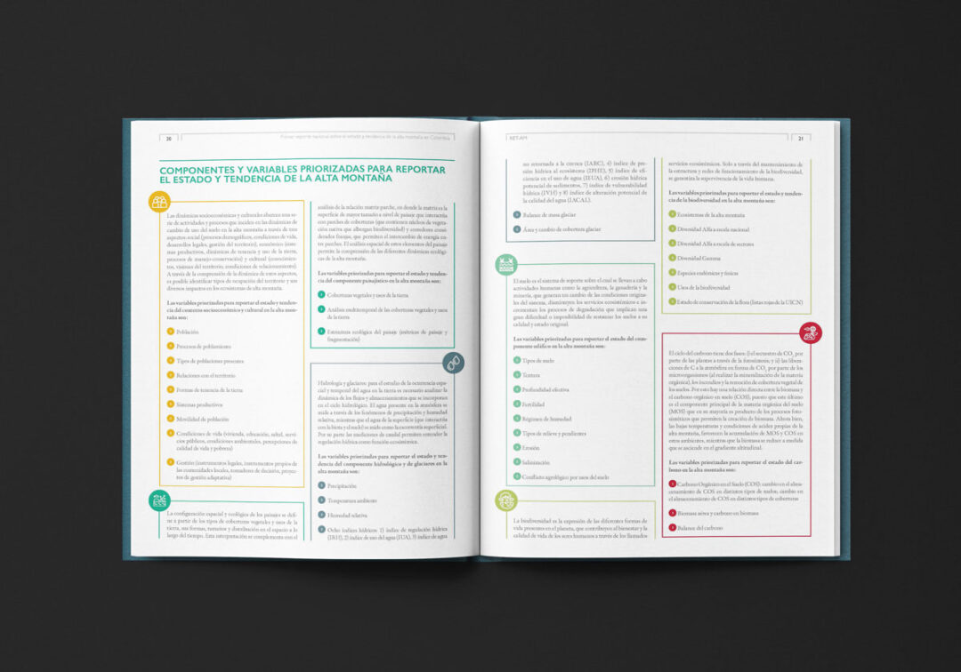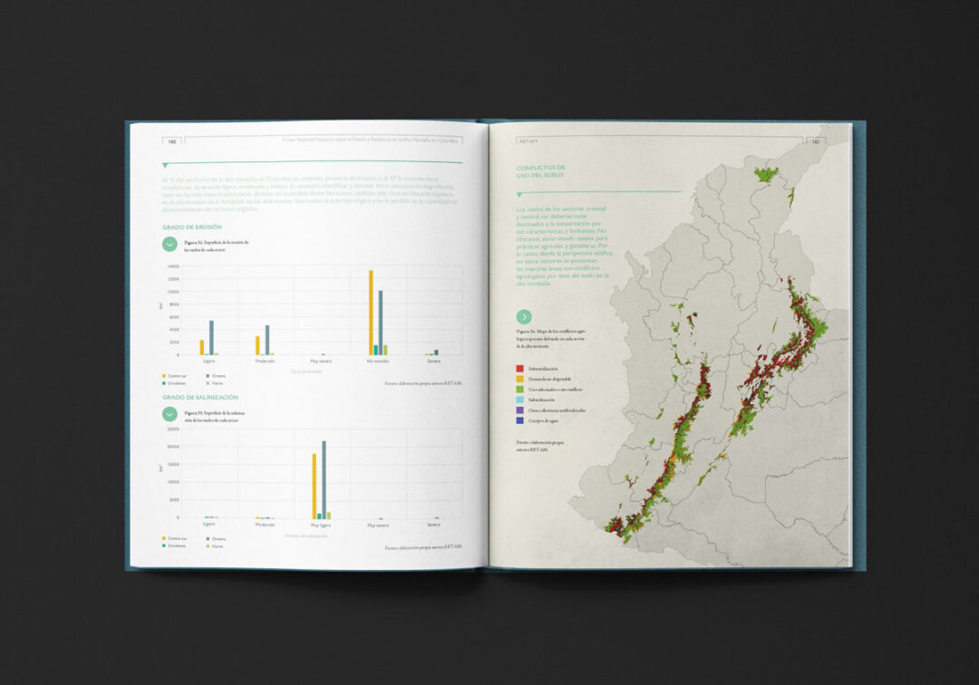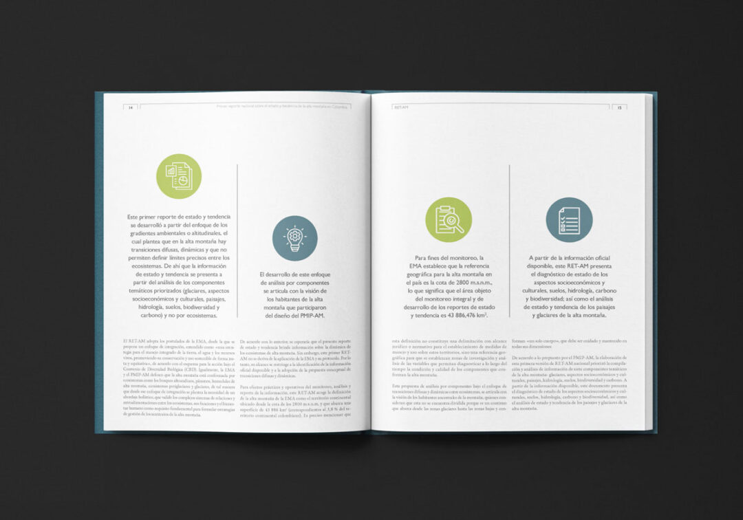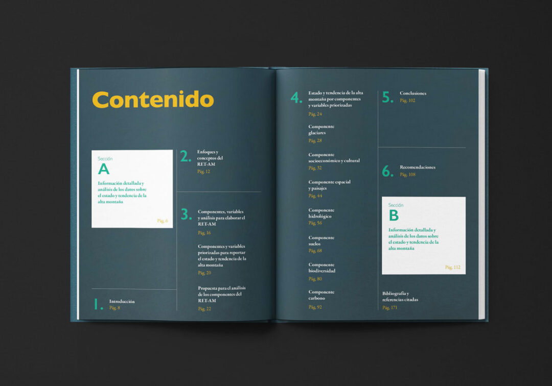El Primer reporte nacional sobre el estado y tendencia de la alta montaña en Colombia (RET-AM), editado y diseñado por Puntoaparte para USAID, MinAmbiente e IDEAM, está conformado por dos secciones: i) el resumen para tomadores de decisión (sección A) con mensajes, hallazgos y datos clave y ii) la información técnica detallada y el análisis de datos que fundamentan los hallazgos del estado y tendencia de la alta montaña (sección B).