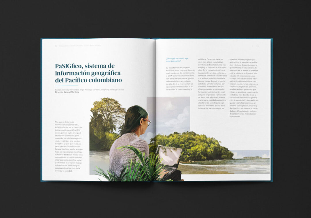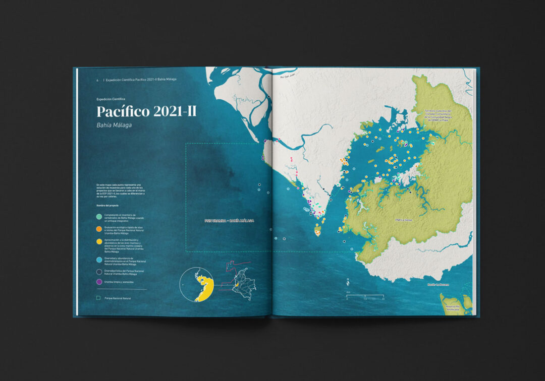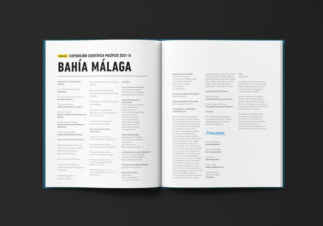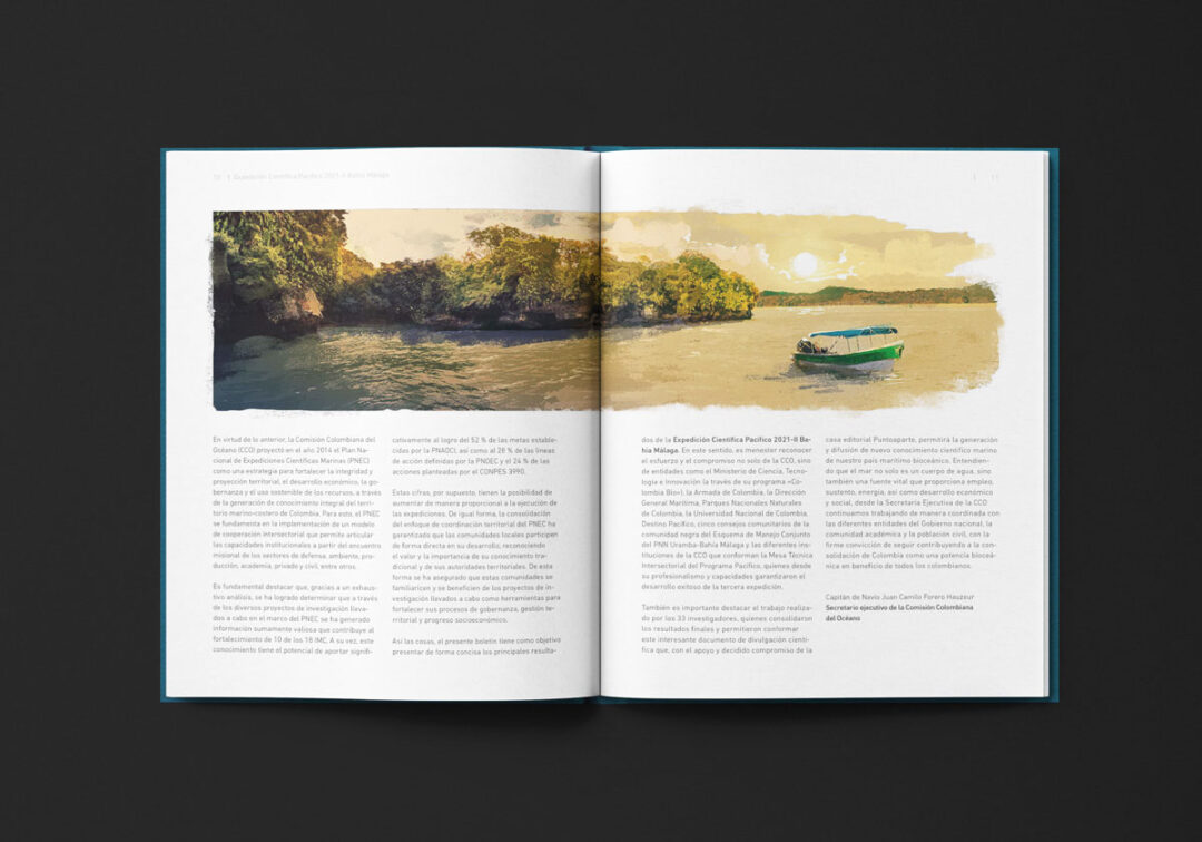 El Boletín Expedición Científica Pacífico 2021-II Bahía Málaga, diagramado e ilustrado por Puntoaparte para la Comisión Colombiana del Océano, presenta los resultados de esa iniciativa en el marco del Plan Nacional de Expediciones Científicas Marinas (PNEC). Esta estrategia fue diseñada para fortalecer la integridad y proyección territorial, el desarrollo económico, la gobernanza y el uso sostenible de los recursos, a través de la generación de conocimiento integral del territorio marino-costero de Colombia.