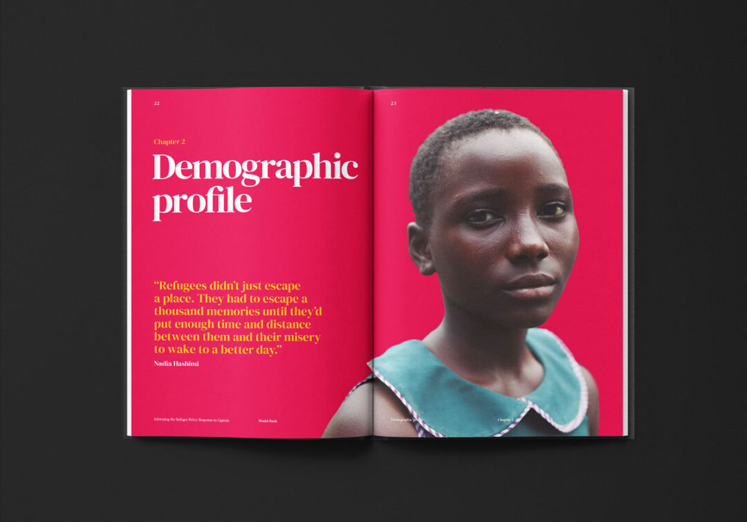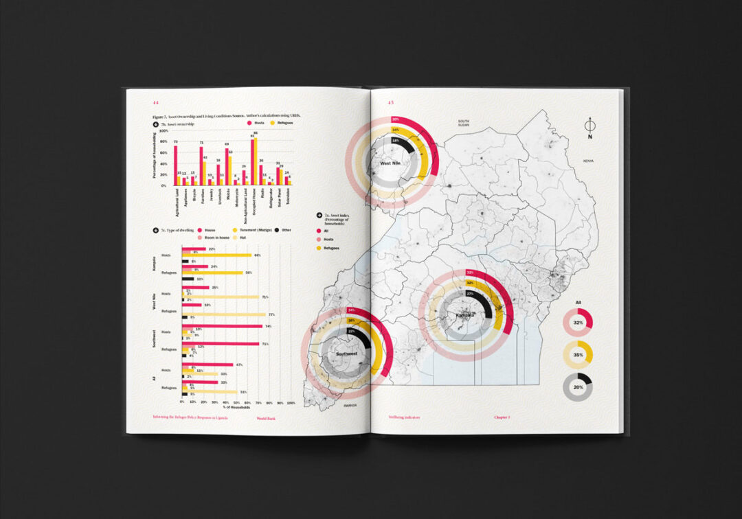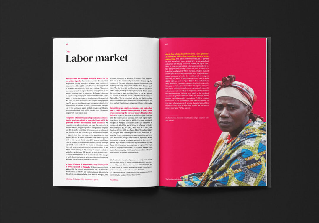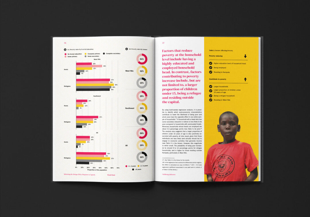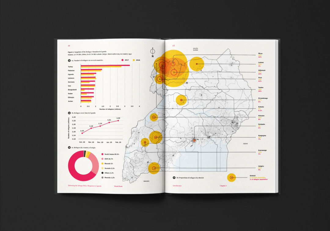 El reporte “Informing the Refugee Policy Response in Uganda”, diseñado y diagramado por Puntoaparte, es una iniciativa de la Oficina de Estadísticas de Uganda, la Oficina del Primer Ministro y el Banco Mundial que utiliza datos de encuestas de hogares (especialmente de 2018) para analizar las condiciones de vida, los niveles de pobreza y el acceso a servicios tanto de las personas refugiadas como de las comunidades de acogida.