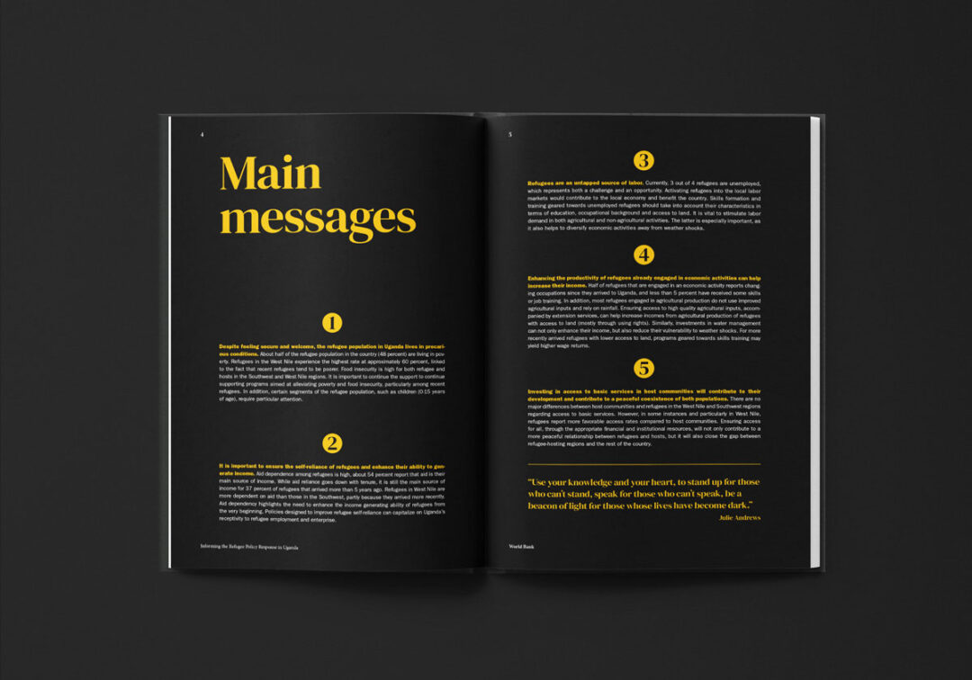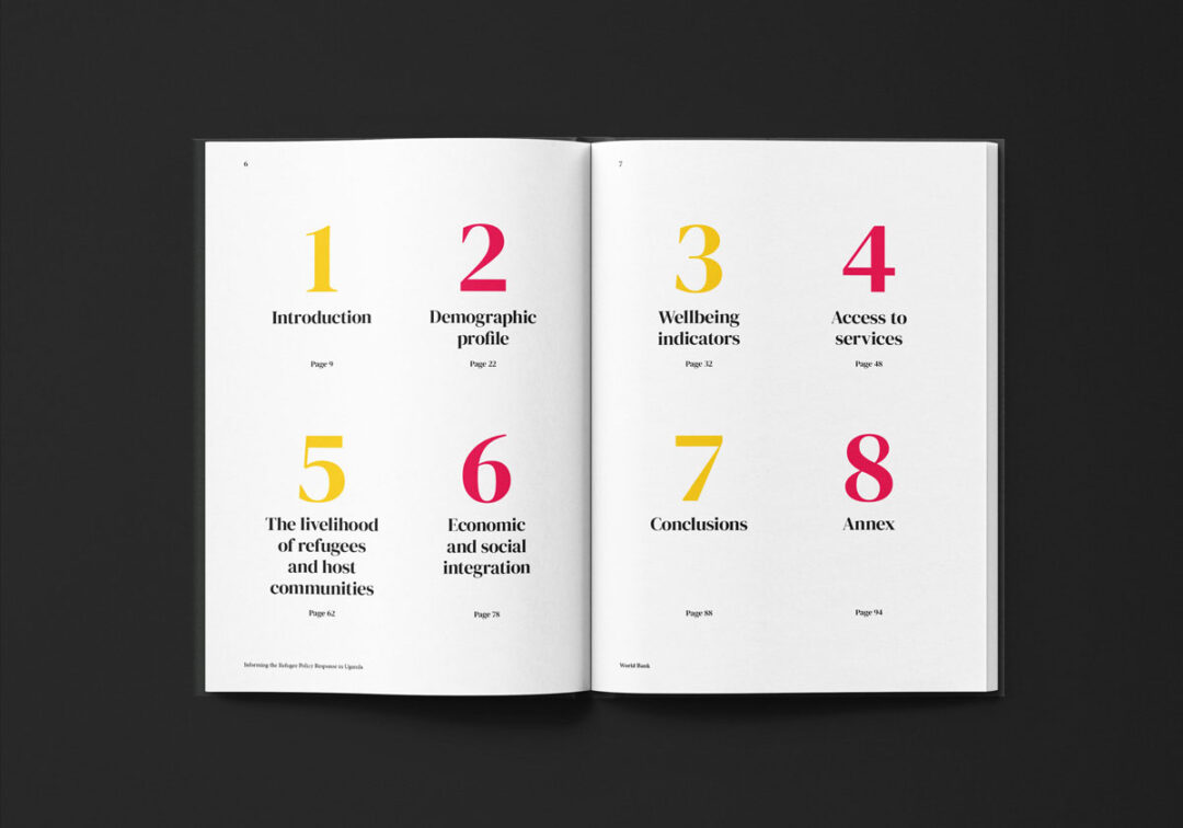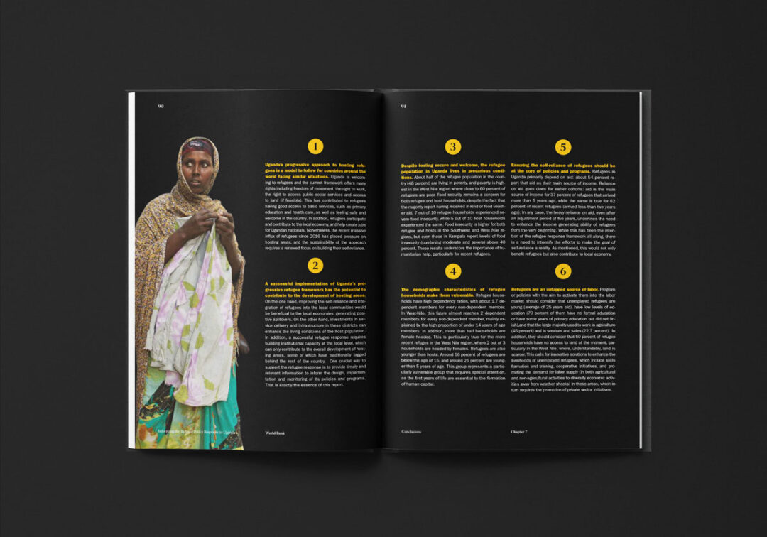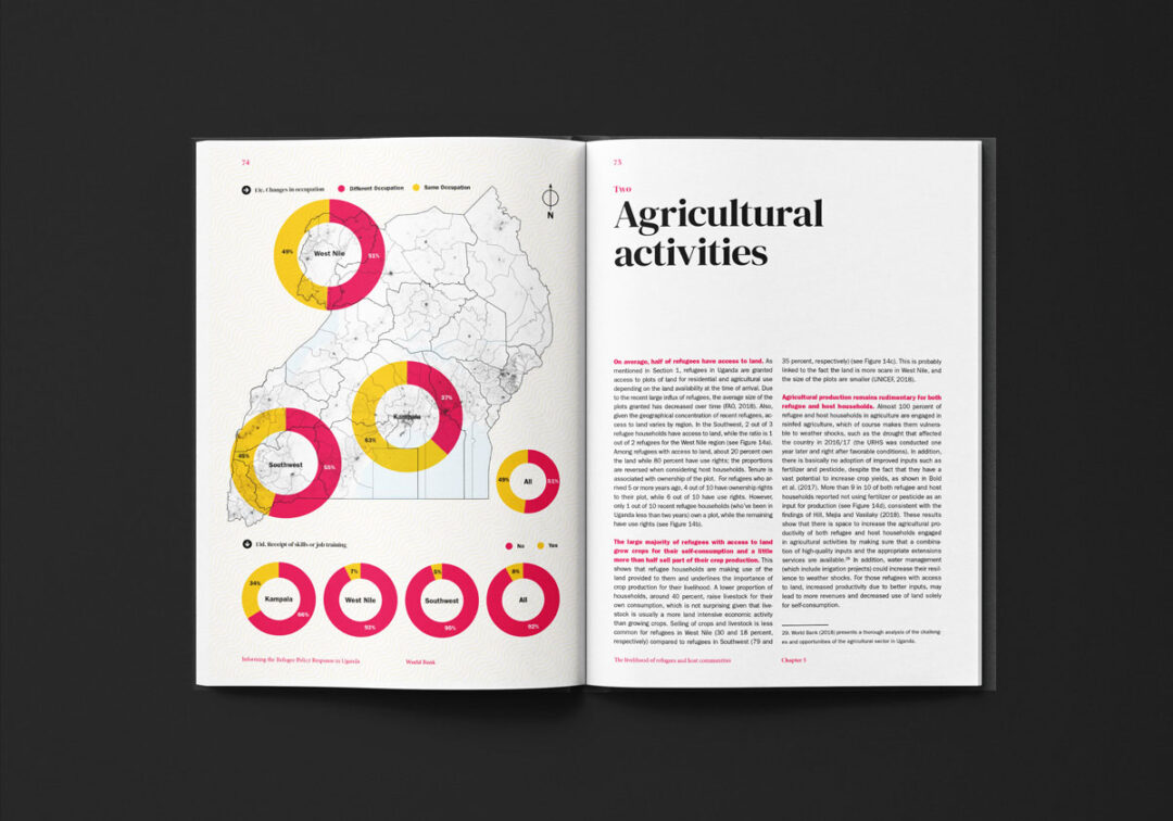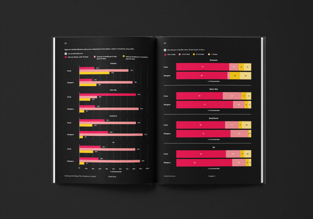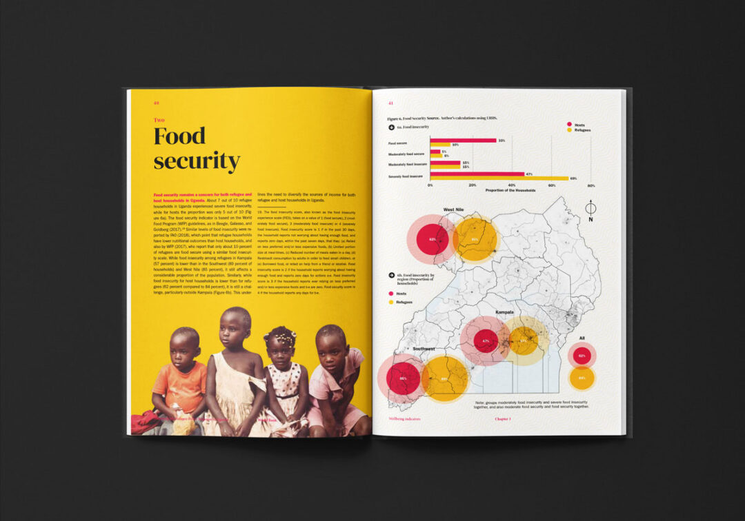 El reporte “Informing the Refugee Policy Response in Uganda”, diseñado y diagramado por Puntoaparte, es una iniciativa de la Oficina de Estadísticas de Uganda, la Oficina del Primer Ministro y el Banco Mundial que utiliza datos de encuestas de hogares (especialmente de 2018) para analizar las condiciones de vida, los niveles de pobreza y el acceso a servicios tanto de las personas refugiadas como de las comunidades de acogida.