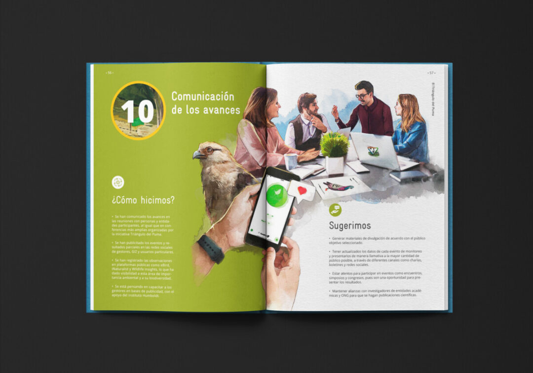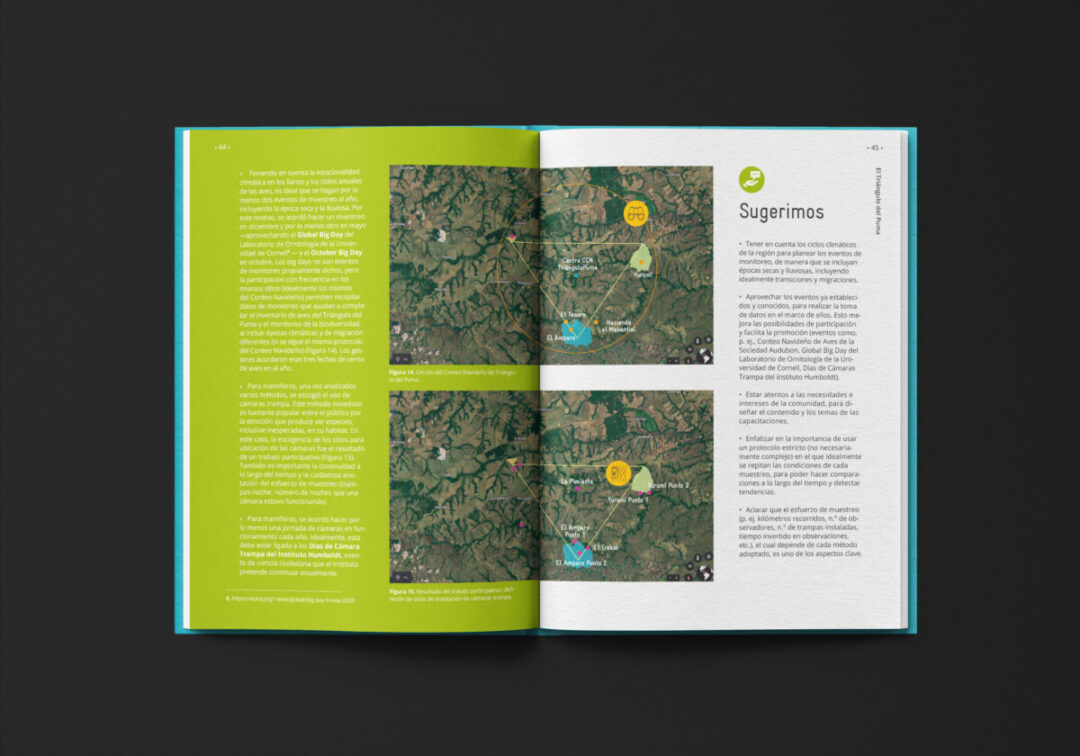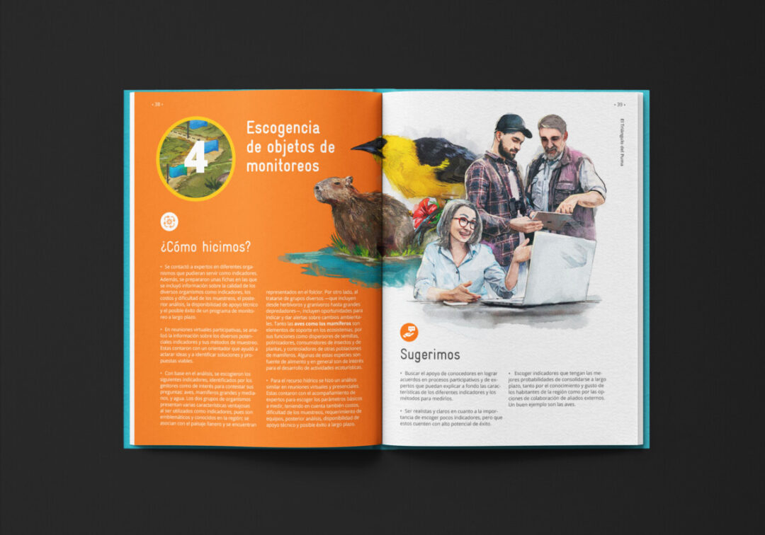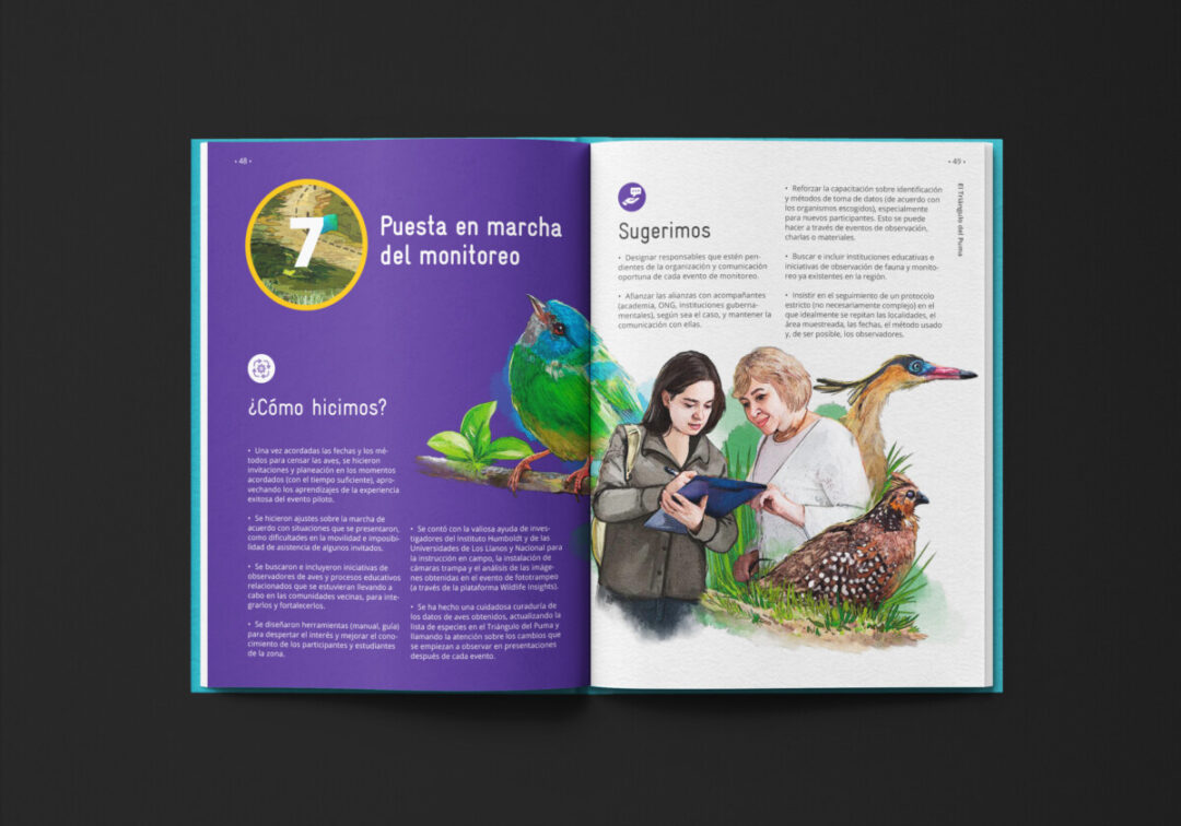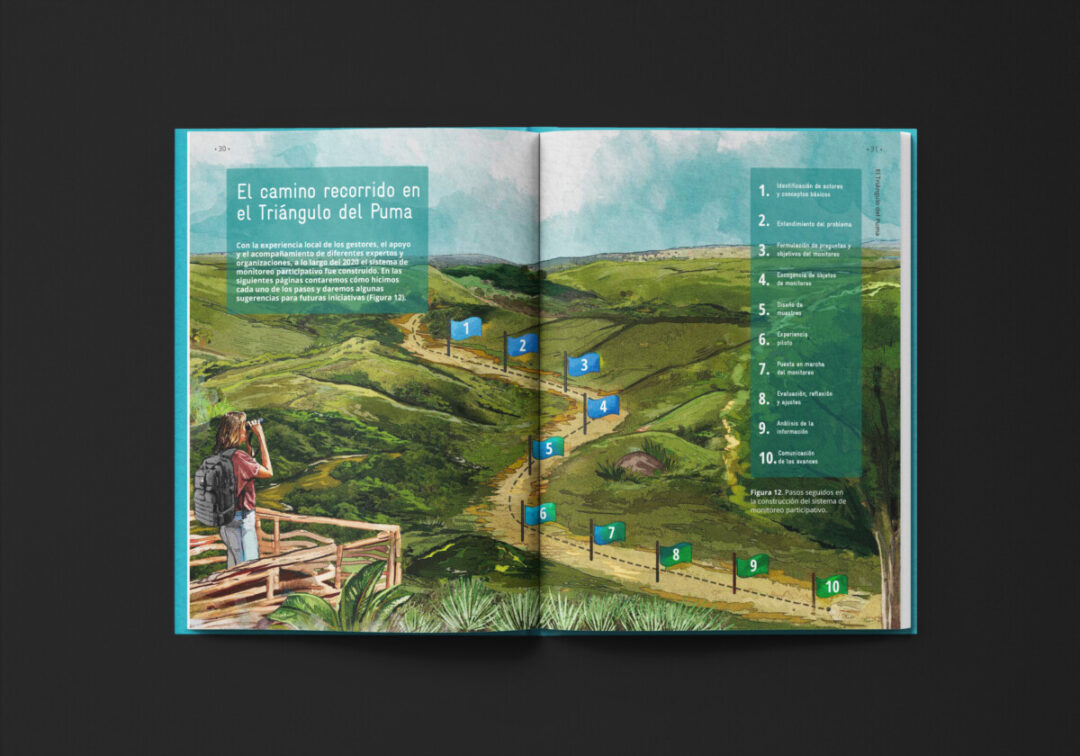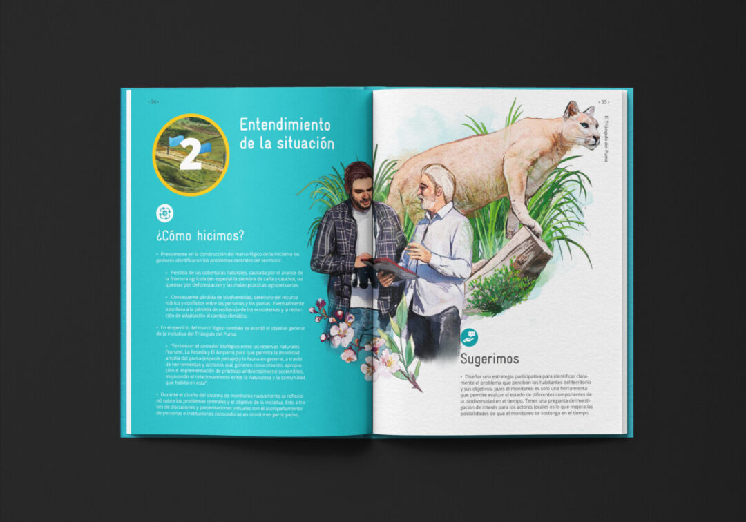 Esta guía, comisionada por la a Cooperación Alemana para el Desarrollo-GIZ y el Ministerio de Ambiente Desarrollo Sostenible, y diseñada e ilustrada por Puntoaparte, recoge la experiencia de monitoreo colectivo de biodiversidad que tuvo lugar en el Triángulo del Puma.