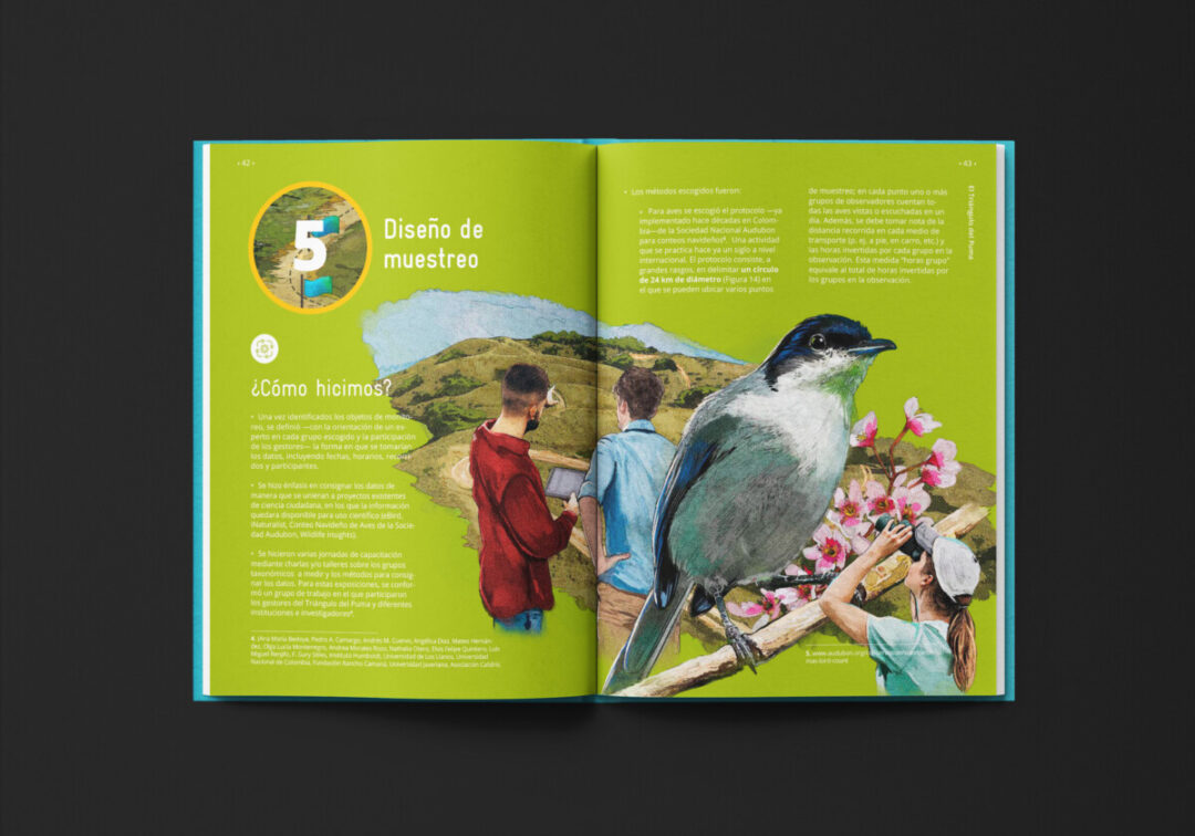 Tomado del prólogo de Román Tibavija Cipagauta: «Los diez pasos del plan de monitoreo participativo fueron diseñados en ambientes o bien de contacto directo con el entorno natural o en espacios de intercambio de conocimientos y experiencias, tanto presenciales como virtuales. En ambos casos, las constantes fueron el deseo de aprendizaje de nuevos temas, la oportunidad de conocer nuevas personas e interactuar con expertos y, por supuesto, profundizar en el conocimiento de nuestra biodiversidad y su reporte para que las demás personas conozcan de su existencia. Esta energía fue la que permitió el resultado final que se entrega en este manual».